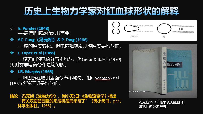 红血球是双凹面,我们很多生物学家说这是生命的需要。因为任何一个生命系统一定有它的用处。我们进行如下分析,第一个,如果红血球是球型,而毛细血管的半径是红血球的1/2,那么红血球会穿不过毛细血管。但如果是双凹型,它就可以变形,从而轻松穿过毛细血管。生物学家把这个理论叫做生机论,这是1948年提出来的。华人物理学家冯元桢和他的学生,在1968年就提出,红血球的形状是因为面积厚度不一样,但后来电镜发现厚度都是一样的。同时期,也有生物学家提出,膜表面的电荷,表面胆固醇分布不均,但都与后来的实验观测结果不符。