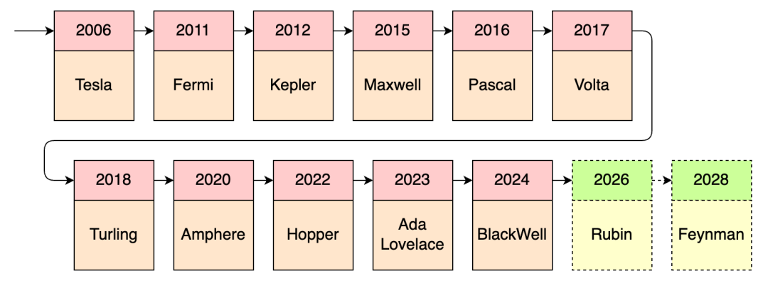 架构名代表是一代技术平台,如Tesla(2006、)Maxwell(2014)、Ampere(2020)、Ada Lovelace(2022)等。