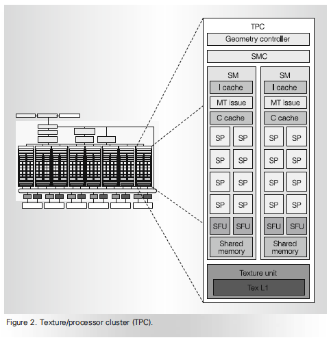 TPC 纹理 / 处理簇首次实现了将传统 GPU 中分离的纹理处理单元和计算单元整合到同一模块中。这就是前面我们提到的(Unified Shader Architecture)的含义。