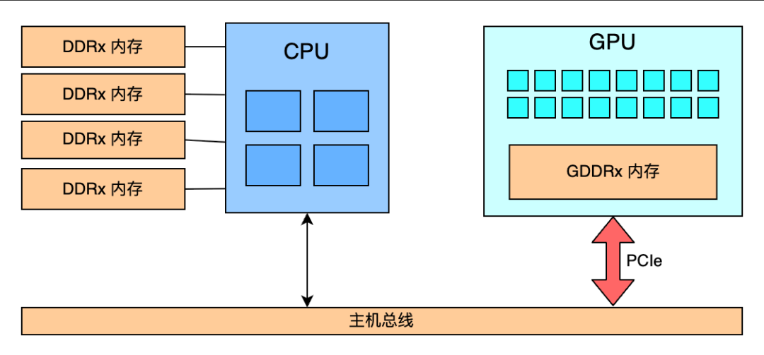 平时我们在 C 语言中使用 malloc 等方式申请的内存是位于和 CPU 相连接的 DDRx 内存中的。那么要进行 GPU 编程的第一步,就是需要有能力操作 GPU 中的 GDDRx 显存(新的英伟达的 GPU 已经不再使用 GDDRx,而是开始使用 HBM 颗粒,这个我们将来再将)。