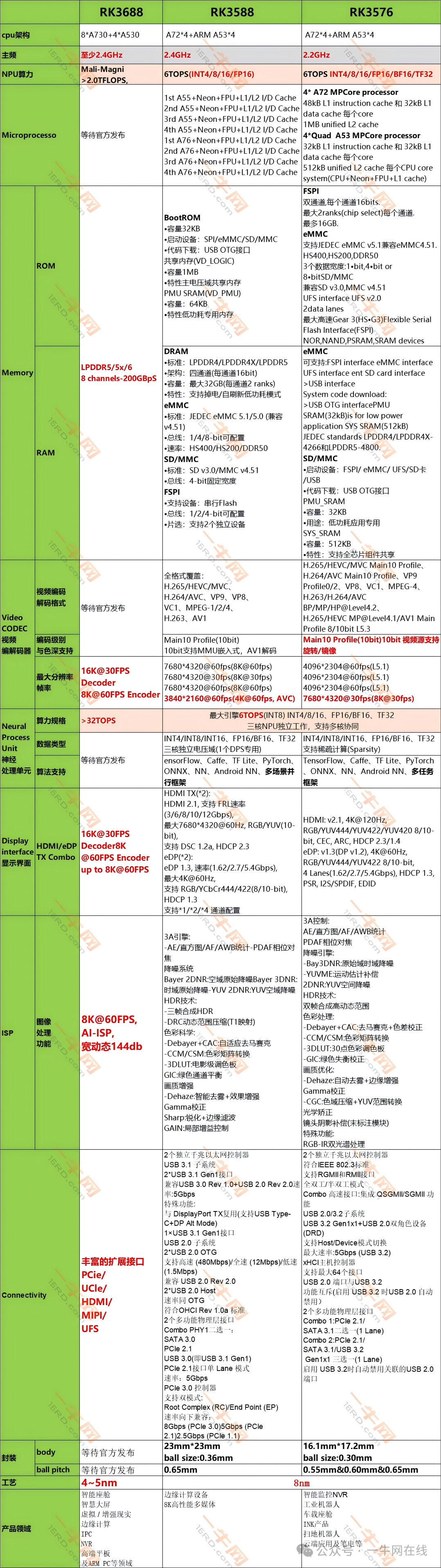 二、内存与存储配置 1. 内存子系统 LPDDR规格: RK3688/RK3588支持LPDDR5/5X(最高200Gbps带宽),极致提升数据吞吐效率; RK3576采用LPDDR4/LPDDR4X,带宽与功耗平衡,适配主流移动设备。 存储接口: RK3688:支持eMMC 5.1(2TB)、UFS 2.1(1TB),满足大容量存储需求; RK3588:兼容UFS 3.1(2TB),读取速度较UFS 2.1提升2倍,适合高速数据交互场景; RK3576:仅支持eMMC 4.51,存储扩展能力有限。 三、多媒体与视觉处理能力 1. 视频编解码 解码性能: RK3688/RK3588均支持H.265/HEVC 16K@30FPS解码,兼容VP9/AV1等格式,覆盖8K超高清视频播放; RK3576解码能力未官方发布,推测支持4K@60FPS主流格式。 编码能力: RK3688/RK3588标配8K@60FPS H.265编码,支持多流实时编码(如直播推流、视频会议); RK3576编码能力较弱,适合1080P@30FPS级应用。 2. 显示与图像处理 显示接口:三款芯片均支持HDMI 2.1/eDP,其中RK3688/RK3588可达8K@60Hz输出,RK3576支持4K@60Hz,适配高端显示器与智能座舱屏幕。 图像增强:RK3588独有14bit宽动态范围(WDR)与144dB高动态范围(HDR),支持专业级影像处理,适用于安防摄像、工业相机;RK3688/RK3576提供基础HDR与色彩校准,满足消费级显示需求。 四、连接性与扩展性 三款芯片均集成丰富外设接口,覆盖主流通信与扩展需求: 高速接口:PCIe 3.0/4.0(支持显卡/网卡扩展)、USB 3.1 Gen2(10Gbps)、MIPI CSI/DSI(摄像头与显示连接)。 网络能力:集成千兆以太网控制器,RK3588额外支持PCIe网卡扩展,满足工业级联网需求。 存储扩展:支持SATA 3.0、UFS、eMMC,构建灵活存储架构。 五、封装工艺与适用场景 1. 制程与封装 RK3688:4nm制程,性能与功耗平衡,适合对空间敏感的中高端设备(如工控机、智能座舱)。 RK3588:23mm*23mm,ball size:0.36mm,采用8nm成熟工艺。 RK3576:制程与封装尺寸待官方发布,推测RK3688延续先进制程,RK3576采用8nm成熟工艺,成本可控。 六、总结与选型建议 三款芯片形成梯度覆盖: 追求极致性能:首选RK3688,搭载8核A73大核+4核A53能效核,全面适配高算力AI支持Transformer、大模型推理、混合精度; 平衡成本与性能:RK3588凭借6TOPS NPU,在中高端智能设备中具备性价比,适用于图像识别、语音识别等; 规模化应用:RK3576以精简架构与可控成本,成为AIoT设备的主流选择。 开发者可根据具体算力需求(NPU/CPU)、显示分辨率、存储扩展性及功耗预算,针对性选择适配方案。随着官方技术文档完善,三款芯片的落地场景将进一步细分,推动嵌入式智能设备向多元化演进。