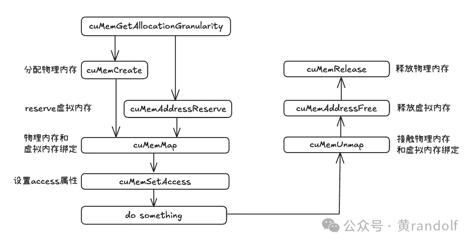 CUresult cuMemGetAllocationGranularity(size_t* granularity, const CUmemAllocationProp* prop, CUmemAllocationGranularity_flags option); CUresult cuMemAddressReserve(CUdeviceptr* ptr, size_t size, size_t alignment, CUdeviceptr addr, unsigned long long flags); CUresult cuMemCreate(CUmemGenericAllocationHandle* handle, size_t size, const CUmemAllocationProp* prop, unsigned long long flags); CUresult cuMemMap(CUdeviceptr ptr, size_t size, size_t offset, CUmemGenericAllocationHandle handle, unsigned long long flags); CUresult cuMemSetAccess(CUdeviceptr ptr, size_t size, const CUmemAccessDesc* desc, size_t count); CUresult cuMemUnmap(CUdeviceptr ptr, size_t size); CUresult cuMemAddressFree(CUdeviceptr ptr, size_t size); CUresult cuMemRelease(CUmemGenericAllocationHandle handle);rity_flags option);