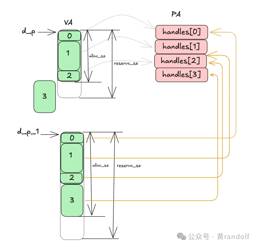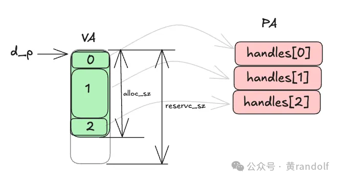 下图展示了VMM vector各个变量的之间的关系。d_p是一段连续的虚拟地址(VA),但它印社的物理内存(PA)可以不连续。例如VA块0→ handles[0],VA块1→handle[1]…