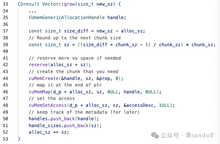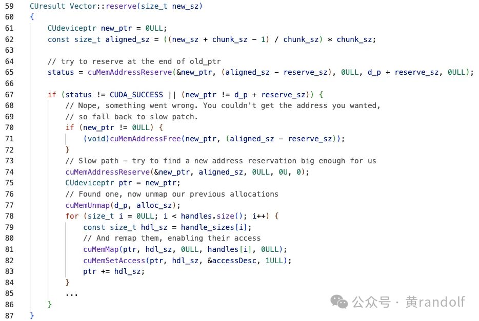 在VMM版的revsere函数中,如果需要的空间比剩余VA 空间大,则调用 cuMemAddressReserve 试图在 d_p + reserve_sz 之后继续保留一段连续 VA 空间。但是如果连续空间被其他应用占用,则会返回一段不连续的 VA(new_ptr ≠ d_p + reserve_sz),这个时候就需要走到slow path,重新分配一段更大的VA空间。并且重新cuMemMap 已有的物理内存到新 VA 空间。当调用到grow函数时,新的物理内存通过 cuMemCreate 分配,并映射到 VA 中剩余的空闲位置中。