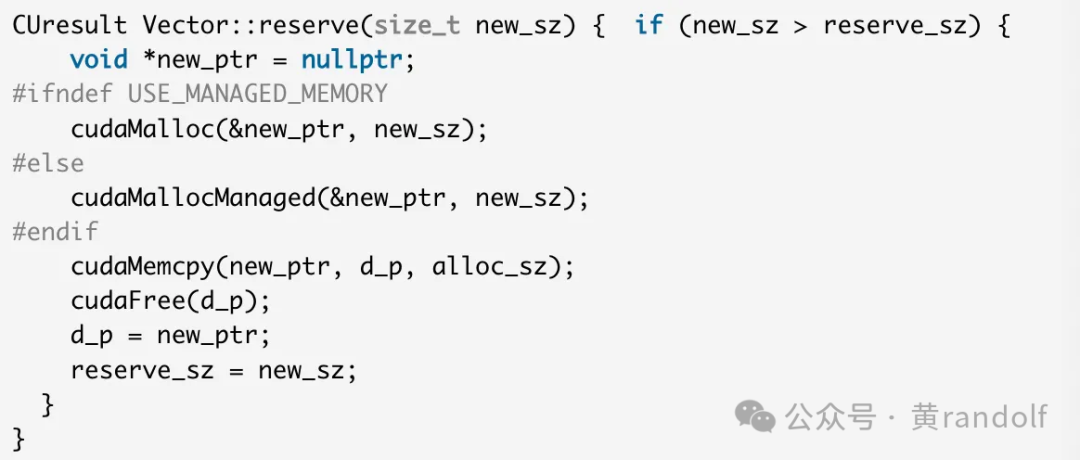 在 cudaMalloc 版本的 reserve 实现中:1)当需要的容量 new_sz 大于当前已保留容量 reserve_sz 时,必须重新分配一块更大的内存(new_sz)。2)然后把原有数据拷贝到新分配的内存中。3)最后释放旧内存,用新指针 new_ptr 作为存储区域。