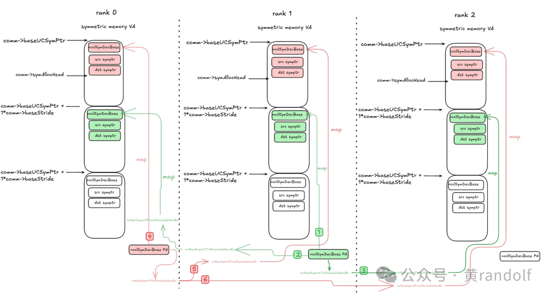 ncclSymDevBase 结构,这里offset=0 。例如,对于rank 1上分配的 ncclSymDevBase 结构,映射到rank 0的comm->baseUCSymPtr + 1 * comm->baseStride 位置;映射到rank 1的comm->baseUCSymPtr + 1 * comm->baseStride ;映射到rank2相同偏移位置。VA和PA绑定后,每个 rank 都能访问其他 rank 的物理空间。