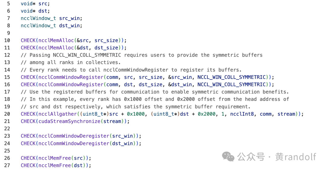 回到第 2 节的示例,在 步骤 1 中调用的 ncclMemMalloc,本质上是通过 VMM API 分配空间并完成映射,返回 VA 地址。而在 步骤二 中调用的 ncclCommWindowRegister 则注册 src/dst buffer,该 API 是 NCCL 2.27 新增的用户接口。该接口负责完成sysmmetric memory相关注册工作。symmetric主要的机制在该函数函数中实现。