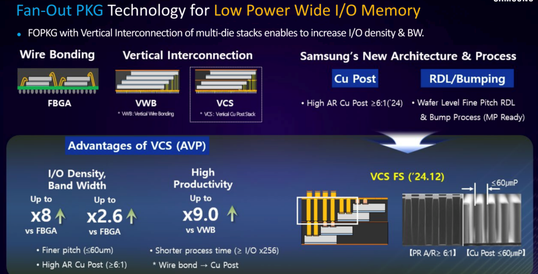 针对移动AI对低功耗宽I/O内存的需求,三星进一步推出多芯片堆叠FOPKG技术。通过采用高纵横比铜柱(AR>6:1)和精细间距RDL设计,该技术实现了I/O密度提升8倍、带宽提高2.6倍的性能飞跃,同时生产率较传统垂直引线键合技术提升9倍,在提升性能的同时兼顾了量产经济性。