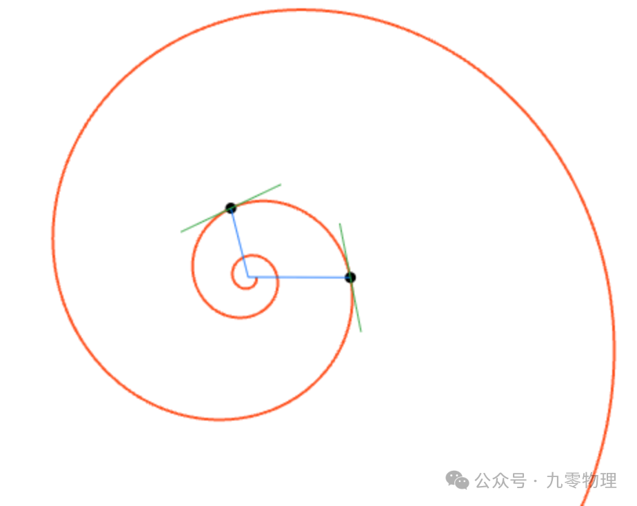 随后,雅各布·伯努利给出了这条曲线的一个神奇特性:每个点的切线与该点到原点的连线,成固定夹角,满足: