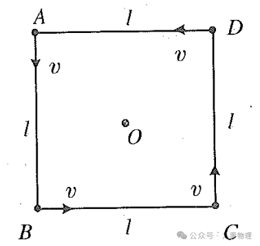 从一种简单情况开始。有四只小虫等距排列,如图所示,每只虫保持恒定速率运动,且方向始终朝着身旁的虫。问每只虫子的运动轨迹方程?