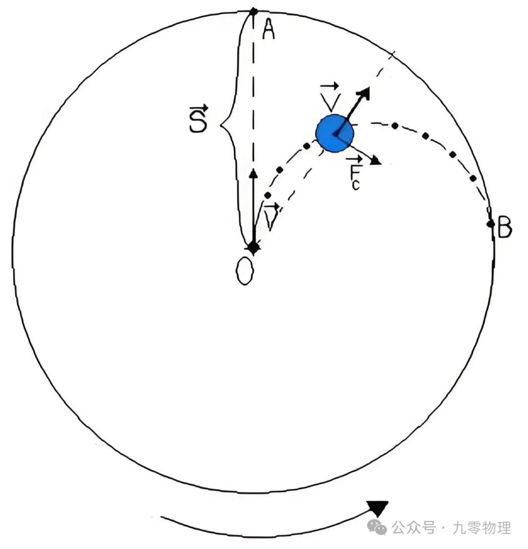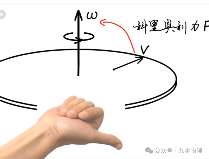 想象一个水平放置的圆盘,你尝试从中心走向边缘。如果圆盘不转,你可以沿着一条半径直线抵达边缘。但如果圆盘转动起来(比如俯视逆时针旋转),你会受到一个垂直速度向右的力——科里奥利力,偏离原来的轨道。