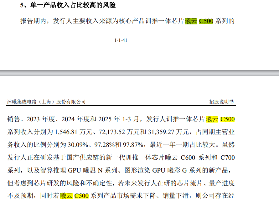 不过细观收入结构,单一集中依赖性愈发明显。2023年到2025年一季度,公司主要收入来源为训推一体芯片曦云C500系列。分别贡献1546.81万元、7.22亿元和3.14亿元的收入,占同期主营业务收入比达30.09%、97.28%和97.87%。对此潜在风险。招股书坦言“若曦云C500系列产品市场需求下降、销量下滑,则公司存在经营业绩下滑的风险”。