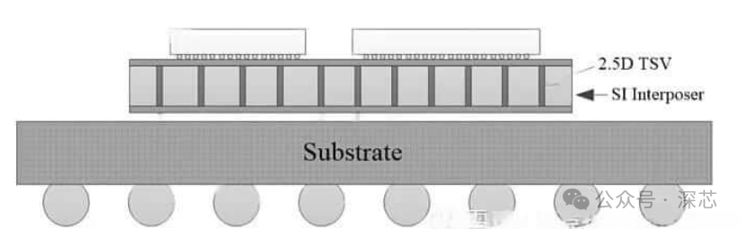 最常见的2.5D集成技术是硅中间层的TSV集成。芯片通常通过 MicroBump 连接到中间层;硅衬底作为中间层,通过凸块与衬底连接;硅衬底表面通过RDL接线;TSV作为硅衬底上下表面之间的电气连接通道。这种 2.5D 集成适用于具有高引脚密度的大型芯片。FlipChip 芯片通常安装在硅基板上。
