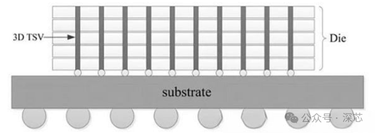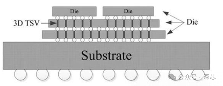 在多个芯片的 3D 集成过程中,两种不同类型的芯片通常垂直堆叠,通过 TSV 电耦合,并连接到下层基板。有时,RDL 会蚀刻在芯片表面以连接顶部和下部 TSVS。