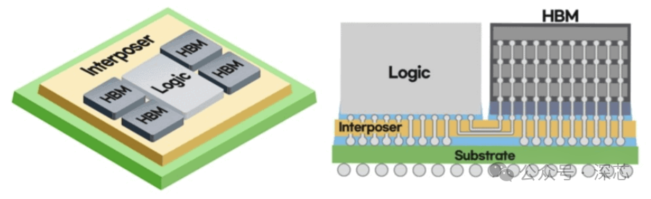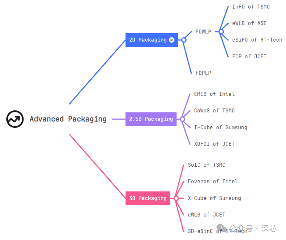 2.5D封装通常是指2D和部分3D属性,代表技术包括英特尔EMIB、台积电CoWoS和三星I-Cube。