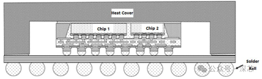 物理结构:所有芯片和无源器件都在XY平面上方,至少在中间层(Interposer)上安装了一些芯片和无源器件。XY平面上方是中间层布线和通孔,XY平面下方是基板布线和通孔。