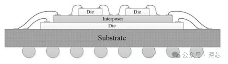 硅中间层的无TSV2.5D一体化结构一般如下图所示。将大型裸芯片直接安装在基板上,芯片与基板之间的连接可以通过键合线或倒装芯片进行。由于面积大,可以在大芯片的顶部安装多个较小的裸芯片。但是小芯片不能直接连接到基板上,因此您需要插入一个中介层,在其上方安装多个裸芯片。中间层具有 RDL 布线,将芯片的信号引导至中间层的边缘,然后通过键合线引导至基板。这种类型的中间层通常不需要TSV,只需通过中介层上表面的布线进行电气互连,通过键合线和封装基板连接。