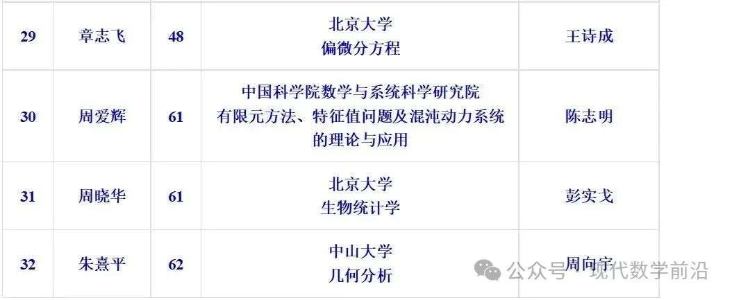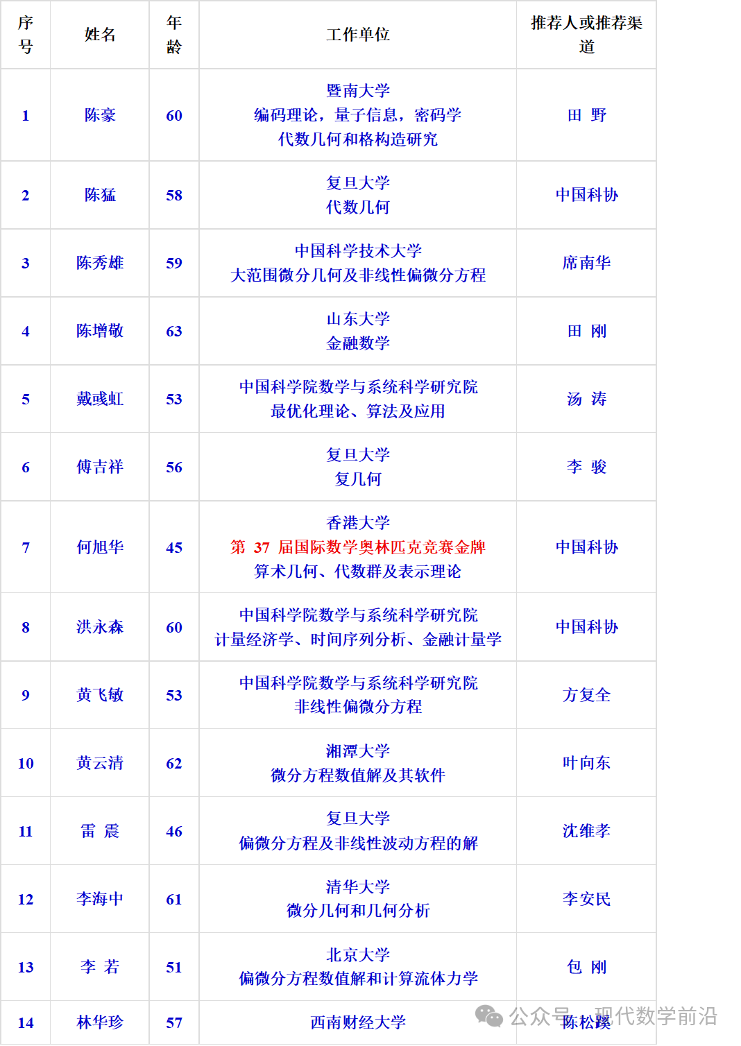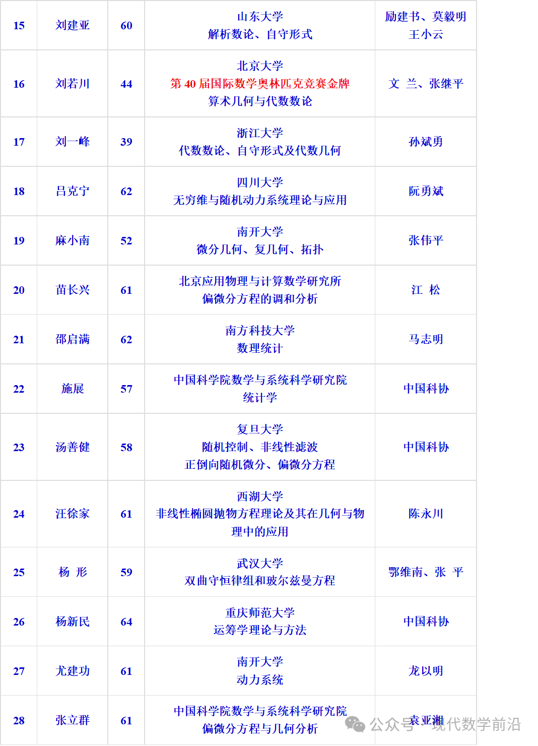 7.刘建亚(差ICM,四大):国内数论的稀有人物,师从数论老前辈,根正,行政远大于学术。 8.刘若川(差ICM):国内代数几何强劲人物,刚上任北大副院长,数学会副理事长。在北大黄金一代里也不算最突出。近期有北大数学力挺,上是迟早的事。实际上在北大里不算最突出的那几个,但能被先力推,说明有的不止学术。刘若川跟田野同时拿的二等奖,他们都是做算术几何的,田野已经上了。刘若川没有45分钟报告,不过北大如果力挺应该也很有希望。北大一直有推他,黄金一代里比他厉害的都在国外,他应该是不如张伟许晨阳的。 9.刘一峰: 超院士水平,独立四大。刚上任浙大副院长。超年轻,还得耕耘。刘一峰出生于1985年,2003年至2007年就读于北京大学数学科学学院,获学士学位,2012年获美国哥伦比亚大学博士学位。他的主要研究领域为代数数论,自守形式,代数几何,曾获2017年美国斯隆研究奖、2018年SASTRA拉马努金奖,现为浙江大学数学科学学院常务副院长。刘一峰钻研的问题与著名千禧年七大数学问题之一的BSD猜想在高维算术几何对象上的推广有关,就在他回国任职这几年,他与合作者在这些问题上取得了突破性进展,其中一项成果发表在了数学领域顶尖的期刊之一《Inventiones mathematicae》(数学新进展)上,论文长达269页。 10.吕克宁(差ICM,二等奖): 美国数学会会士,水平是有的。代表作有一篇JDE,JDE联合主编,但曾经的顶刊没落和其有着关系。 11.麻小南(差二等奖): 超同方向院士水平。有国外索菲亚大奖。国内院士种子选手的多年好搭档。缺点是第一次申请,刚全职回国服役时间短。上是迟早的事,只是时间问题。 12.苗长兴(三无选手):能力是有,长期和数学所张平院士不和。苗长兴是中国科学院数学物理学部院士增选有效候选人,现任北京应用物理与计算数学研究所研究员,主要从事调和分析、非线性色散方程及流体动力学方程的数学理论研究。 出版了《调和分析及其在偏微分方程中的应用》《偏微分方程的调和分析方法》《非线性波动方程的现代方法》等专著,系统总结了调和分析在偏微分方程中的应用。解决了能量临界Schrödinger方程散射猜想等国际数学问题,研究成果发表于《Communications on Pure and Applied Mathematics》《Annals of Mathematics》等期刊。培养了美国斯隆研究奖获得者张晓轶等青年学者,并担任《Mathematical Methods in the Applied Sciences》等国际期刊编委。 13.汪徐家(差二等奖): 超院士水平,四大集齐,独立四大。多年在澳大利亚,澳大利亚科学院外籍院士。居然还不是澳大利亚籍。缺点是第一次申请,刚全职回国服役时间短。上是迟早的事,只是时间问题。 14.杨彤(差ICM):从香港跳到武大,签了某种合同就是为了冲院士。武大另一位想冲院士也得等到杨彤上了再说。 15.尤建功(三满贯,但二等奖排名第三): 勉强的三满,资历够,申请时间够,常年在国内耕耘,近些年来依靠学生菲尔兹奖得主Avila有些合作,似乎也该上了。缺点是二等奖仅排名第三。 16.张立群(三无选手): 水平是最差的,不如很多年轻人,但在基金委等行政待过,最无悬念的蹭热度凑热闹选手。 17.章志飞(差二等奖): 据说那篇四大也不是章的专供擅长小领域。流体力学PDE强劲人物,排队时间不够,有北大数学力挺,下个PDE上就大概率他和汪,上也是迟早的事。章志飞是北京大学数学科学学院副院长、博雅特聘教授,现任数学研究所所长。他于2003年获得浙江大学博士学位,2011年成为北京大学教授,2014年获得国家杰出青年科学基金,2024年荣获陈省身数学奖。他在国际数学家大会发表过45分钟学术报告,并在《Forum of Mathematics, Pi》等顶级期刊发表110余篇论文,被引用超1000次。章志飞主要从事偏微分方程、流体力学及数学理论的研究,在水波方程、Navier-Stokes方程、液晶方程等领域取得重要进展。他主持的《流动转捩机理的数学研究》项目,直接应用于航空发动机设计和风力发电叶片优化,并获得2025年国家自然科学奖提名。 2025年8月,章志飞与韦东奕、邵锋合作完成的论文发表于《Forum of Mathematics, Pi》,该论文被视为数学界的重要突破。此外,他入选2025年中国科学院院士增选名单。 18.朱熹平(差ICM): 超同方向院士能力。一位还算在科研一线的老数学家,同级别国内罕见的存在。培养的学生都是精英,不向学术界输送垃圾选手,多年在国内耕耘。可能是由于交际原因,之前没出现过在有效候选人中。 19.黄云清,男,汉族,1962年12月生,中共党员,湘潭大学教授。他用奋斗筑起数学学术高地,带领所在学科入选国家“双一流”建设学科,培养了以国家杰出青年科学基金获得者为代表的一大批优秀人才。曾获国家自然科学奖二等奖、国家级教学成果奖二等奖、冯康科学计算奖等荣誉。2024年,获评“湖南省教书育人楷模”。上次黄教授与浙大计算数学的包刚老师竞争,惜败于包刚,包刚长期致力于偏微分方程反问题的数学理论、算法及应用研究,还发过JAMS。但上次只选出了两位基础数学,一位计算数学的,按理数学应该还有一个名额。希望黄教授这次能得偿所愿。 2025 年中国科学院院士候选人名单数学学部32人