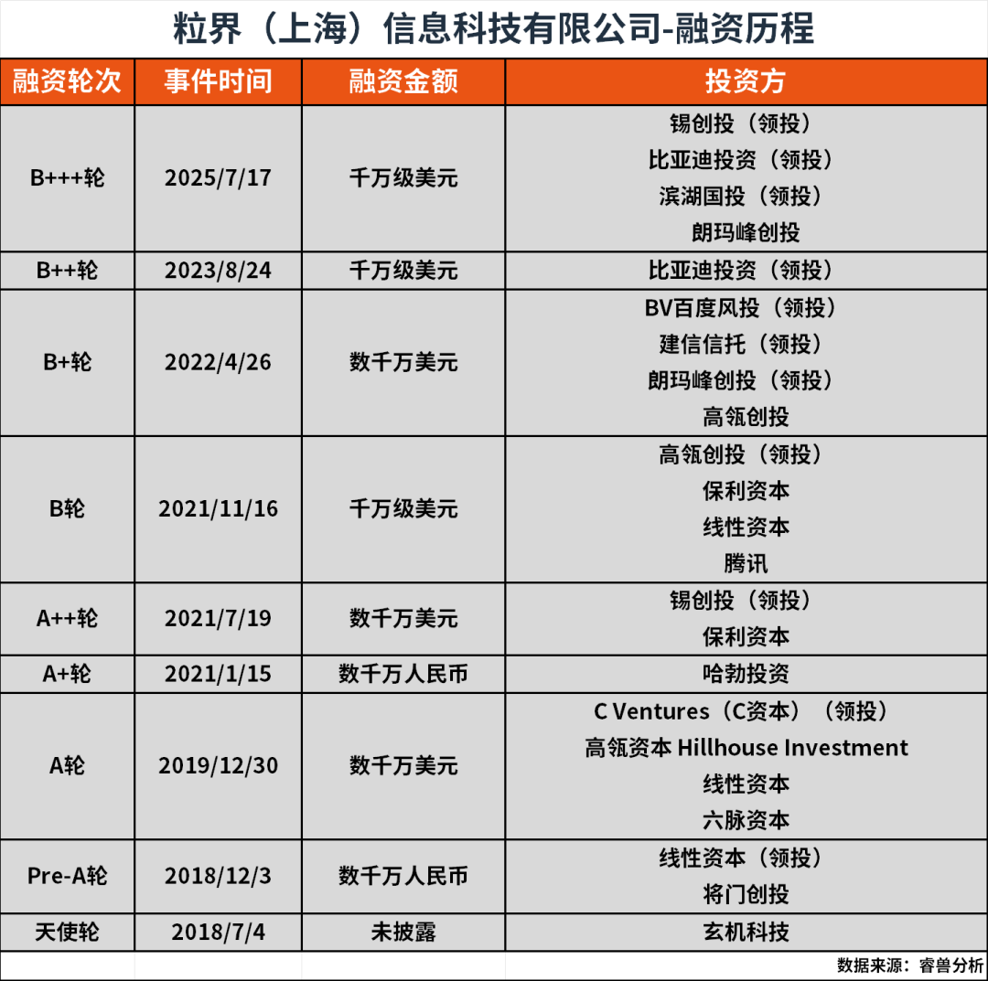 2025年7月,粒界科技完成千万美元级的B3轮融资,由锡创投、无锡滨湖产业集团和比亚迪联合领投,老股东朗玛峰创投跟投。根据公开信息,本轮融资将用于对公司3D图形引擎的原生AI化升级,以及模型训练和人机交互方案的研发,推动公司产品在智能座舱、终端图形、空间智能等垂直场景的商业化落地。