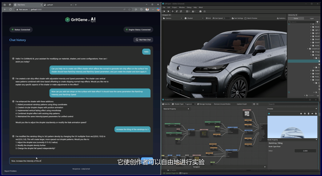 吴小毛透露,粒界引擎近期迭代的版本,已经利用AI大模型首次实现了从编写专业3D特效代码,到脚本,到可视化编程和自动纠错,再到用户界面的全链路打通。