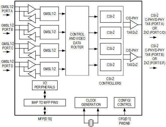 MAX96712支持视频数据的聚合和复制,使来自多个远程传感器的流能够被组合并路由到一个或多个可用的CSI-2输出;