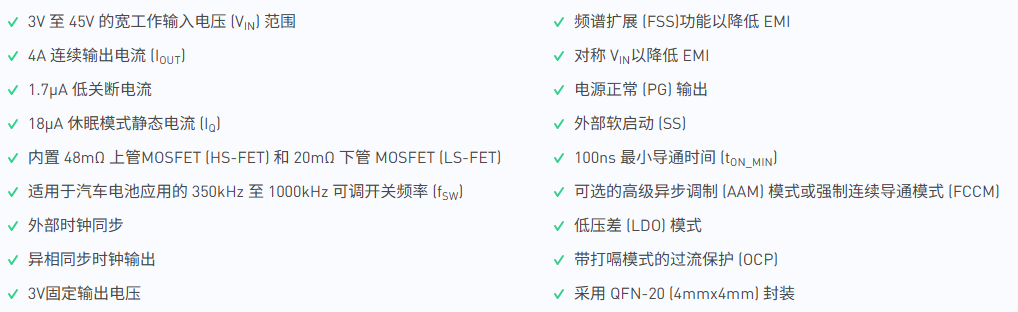 MPQ4314 具有3.3V 至 45V 的宽输入电压 (VIN) 范围,可适应汽车输入环境中的各种降压应用,而1.7μA 的关断电流则允许该器件用于电池供电应用。