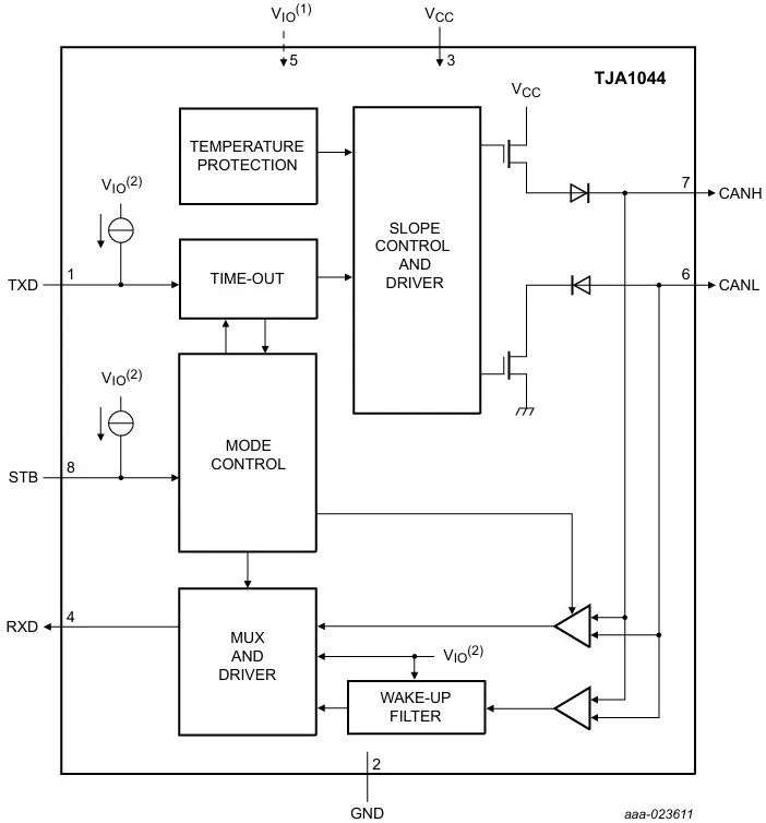 灵活的微控制器接口:配备VIO 引脚的型号可直接与 3.3V 至 5V 的微控制器连接;未配备 VIO 引脚的型号,只要微控制器 I/O 容限为 5V,就可以与 3.3V(TJA1044C 除外)和 5V 供电的微控制器连接,提高了芯片的通用性和兼容性。