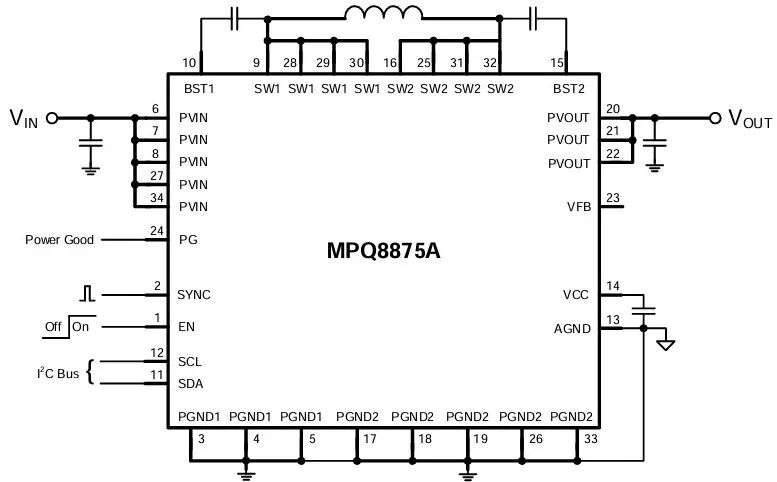 MPQ8875A 通过标准 I2C 接口单独控制;无需任何硬件更改,可通过向设备写入设置来调整各种参数。开关频率可以在 200kHz 至 1Mhz 范围内配置,或通过外部时钟信号同步为 250kHz 至 1Mhz 之间的任何频率。此外,可配置频谱扩展功能可以定期调整开关频率,以改善 EMI 性能。提供可靠的故障保护,包括输入欠压锁定保护(UVLO)、输入过压保护(OVP)、逐周期峰值限流保护、输出过压保护(OVP)、输出短路保护(SCP)和过温关断保护。内置电源正常指示功能,可以指示输出电压调节是否正确。