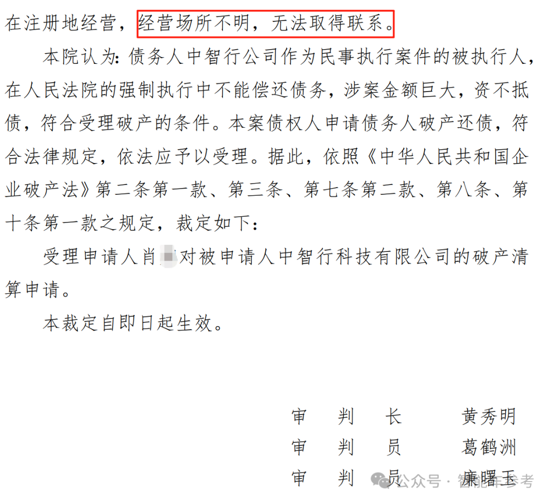 是破产清算而非重组,意味着不再“抢救”了,可能也是因为中智行失联,一直没配合过法院的缘故。