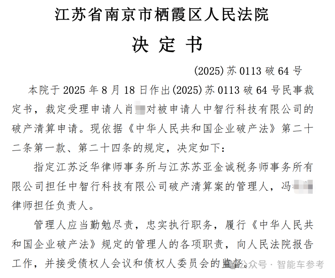 中智行——王劲创办的L4自动驾驶公司,刚刚被法院核准开启破产清算程序: