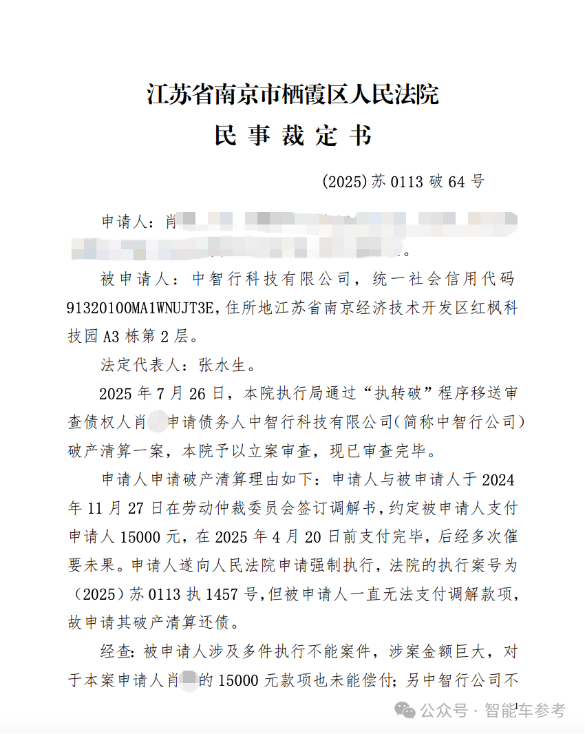 基于种种现实情况,南京栖霞法院认为中智行已经符合破产清算条件,自动进入“执转破”程序,正式受理。