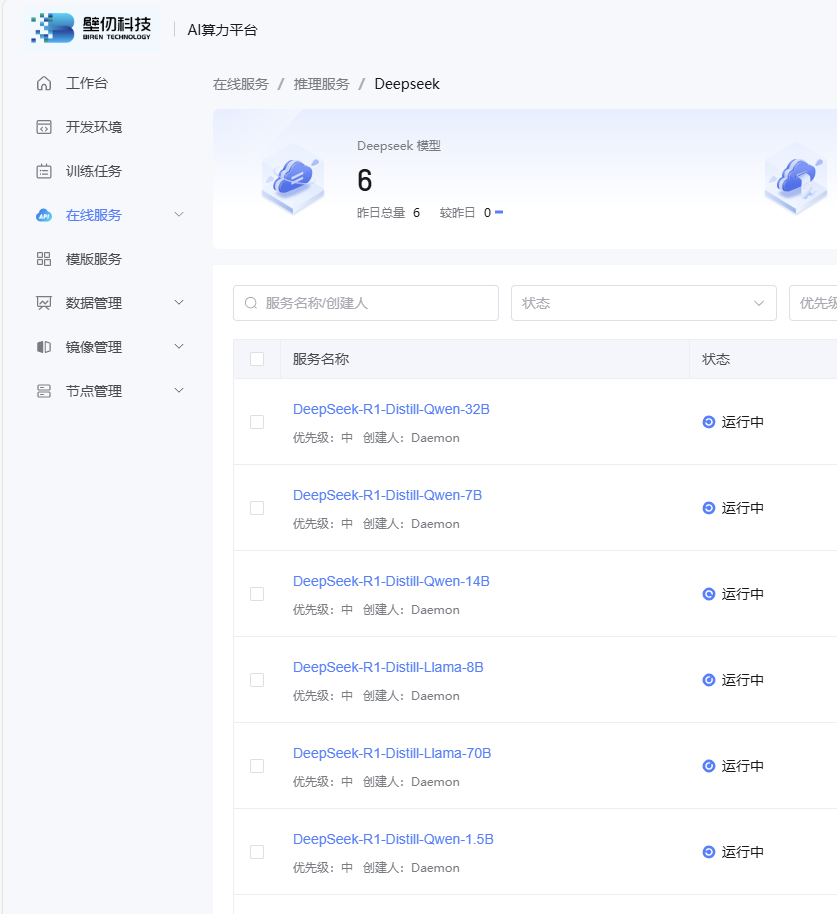 目前,壁仞 AI 算力平台已正式上线 DeepSeek R1 蒸馏模型推理服务,全球开发者可云端体验 1.5B、7B、8B、14B、32B、70B 全系列模型服务。