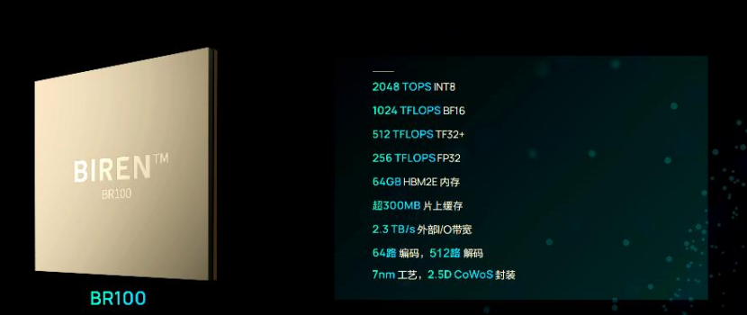 存储方面配备64GB HBM2E高带宽内存和超300MB片上缓存,显著降低数据延迟,同时提供2.3 TB/s的外部I/O带宽,满足多芯片互联与高速数据吞吐。视频处理能力强大,支持64路编码和512路解码,适用于超大规模视频分析场景。BR100的正式发布,标志着全球通用GPU算力纪录第一次由一家中国企业创造,中国的通用GPU芯片正式迈入“每秒千万亿次计算”新时代。