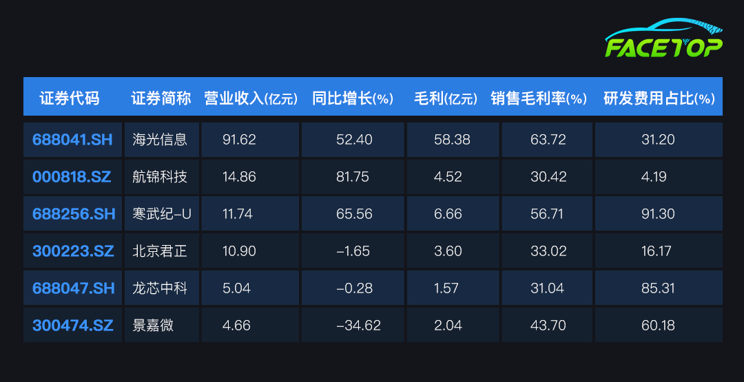 寒武纪作为中国AI芯片领域的先行者,其市场份额为7%,其思元590芯片在性能上已接近英伟达A100的80%,被视为A100的有力国产替代品 。2024年,寒武纪以11.74亿元的营业收入在统计企业中排名第三,同比增长65.56%,增速位列第二,展现出强劲的市场需求与业务扩张能力。其毛利润达6.66亿元,毛利率为56.71%,均排名第二,凸显产品的高附加值和市场定价能力。