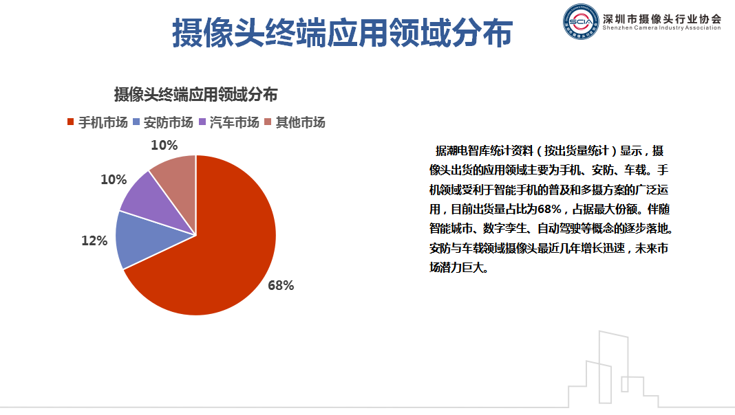 正是这些优秀企业源源输出的创新动力,让中国光学影像产业巍然矗立于世界之巅。根据潮电智库统计,全球摄像头应用领域分布广泛,其中手机占比68%,安防占比12%,汽车占比10%,其他新领域占比10%,市场边界呈现全面扩延之势,总市场规模逼近万亿。