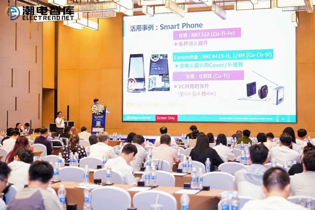 小鹰悠生在峰会现场重点推介了C1990-GSH(HP)、C1995-GSH(HP)这两款超高性能的钛铜薄箔材料。其中C1990-GSH(HP)具有高强度与良好的疲劳特性,抗拉强度达到1400MPa,具有良好的折弯性,已经广泛成熟于VCM马达簧片。自2013年量产以来,出货量年复合增长率高达34%;C1995-GSH(HP)的性能更高,抗拉强度达到1540MPa,较上代产品提升了10%的强度,可对未来摄像头尺寸大型化和高耐久性设计提供良好帮助。