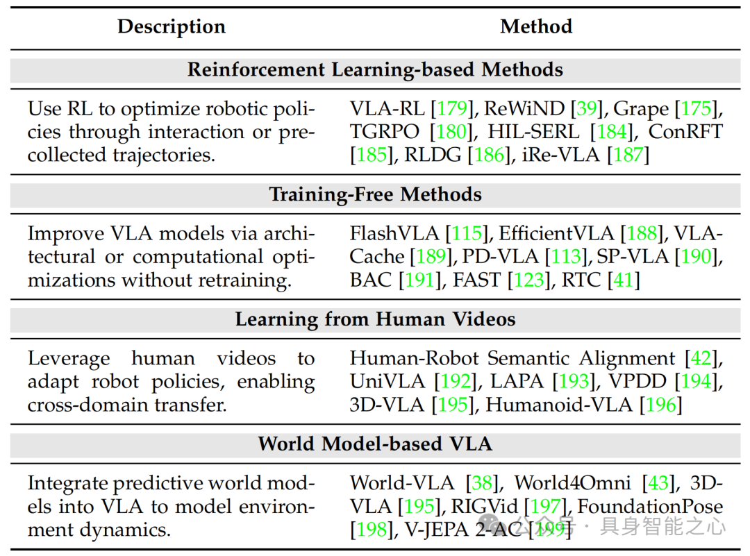 图10|代表性的VLA方法分为四个高级类别:基于强化学习、无训练、从人类视频中学习和基于世界模型的方法。