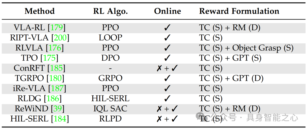 图11|VLA的代表性RL进路。✓代表在线,而✗代表离线。“S”代表稀疏奖励,“D”代表密集奖励,“RM”代表预训练。其中,“GPT”表示GPT给出的奖励,“TC”表示基于任务完成的奖励函数。