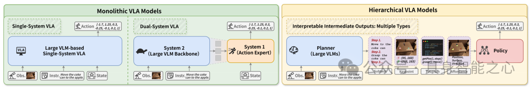 图3|基于VLM的两大类大型VLA模型的比较。单体模型在单系统或双系统架构中集成了感知、语言理解和动作生成,后者包含了一个额外的动作专家。相反,分层模型通过可解释的中间输出(例如,子任务、关键点、程序、功能支持)将规划与策略执行解耦。