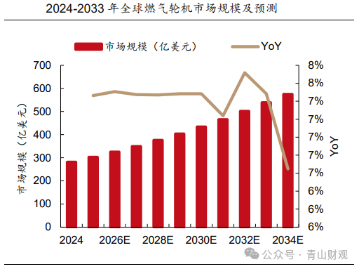 截至2025年7月末,波音、空客分别积压订单6563架、8678架,维持历史高位。飞机订单的积压,导致发动机产业链主公司积极修复和扩充产能,预计航空发动机市场规模年增速维持在8.9%。