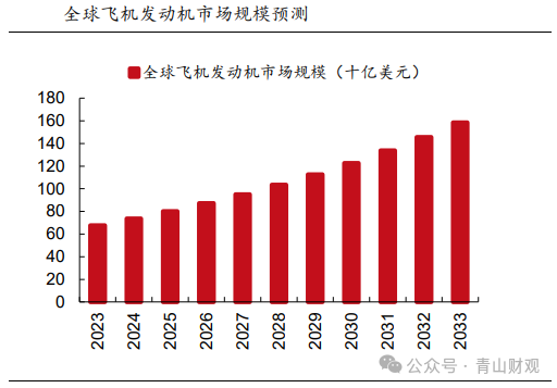美国通用电气航空集团公司(GE航空)、普惠公司(P&W)、英国罗罗公司(RR)以及法美合资的CFM四家公司在全世界民用发动机市场份额接近90%。预计未来全球航空发动机市场规模年增速维持在8.9%,到2033年全球市场规模预计达1585.7亿美元。