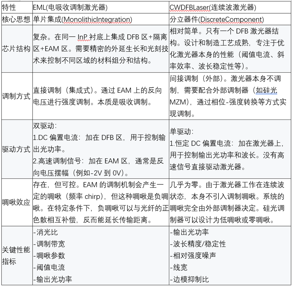 EML(电吸收调制激光器)与CW(连续波激光器)在成本上的差异主要体现在芯片设计、材料、制造工艺、封装测试及系统应用等环节,具体区别如下: