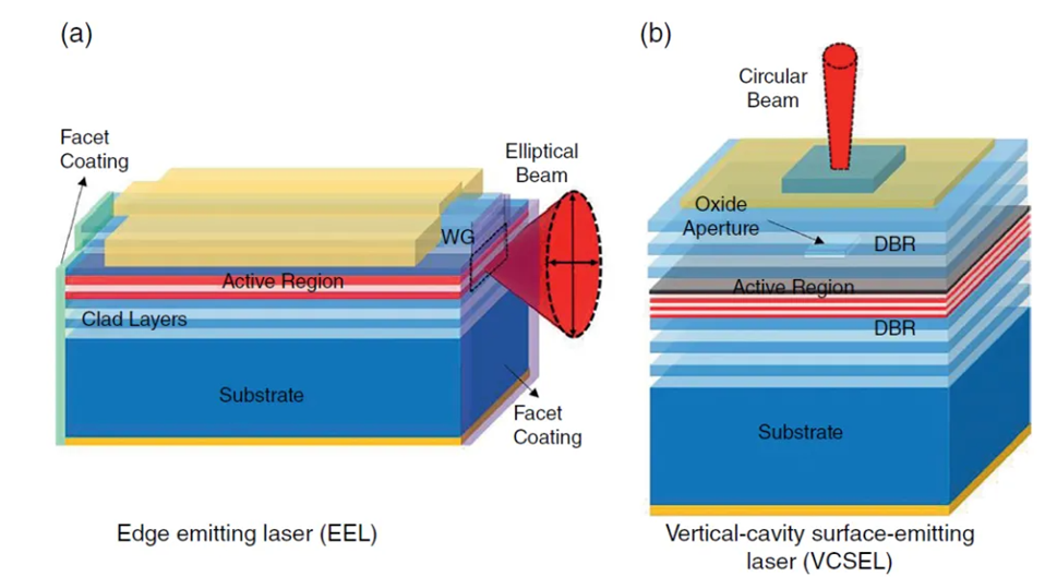 边发射激光器(EEL):光子沿晶格平面方向输出 特点:高功率输出(>10W)、窄线宽(<1MHz) 应用:光纤通信、激光加工 典型结构:双异质结(DH)、量子阱(QW) 垂直腔面发射激光器(VCSEL):光子垂直于晶面输出 特点:二维阵列集成、圆形光斑、低阈值电流 应用:LiDAR、数据通信、生物传感 技术突破:分布式布拉格反射镜(DBR)替代解理面