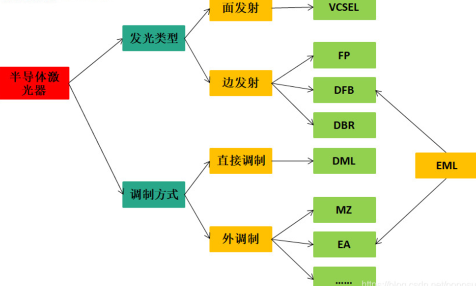 VCSEL、FP、DFB都是独立器件,如果要发光传信号,就是用有无电流来驱动,叫做直接调制激光器,DML(DirectlyModulatedLaser);EML是集成器件,一个芯片上有两个模块,一个是激光器laser,就是L,另一个是EAM调制器,合在一起叫做EML。