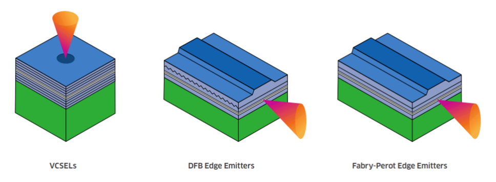 如VCSEL可以提供高质量的激光束,更高的耦合效率和空腹反射率。相比FP激光器和DFB激光器,VCSEL制造比较容易,这样就能够生产低成本基于VCSEL的收发器,主要用于短距离光模块中。