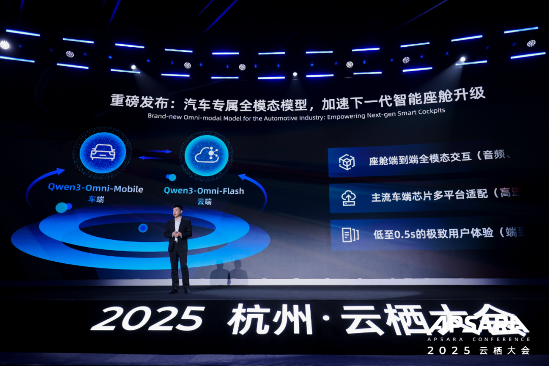 阿里云在这次大会上首次公布了他们最新的座舱领域车端与云端配套的全模态模型「Qwen3-Omni-Mobile」和「Qwen3-Omni-Flash」。它们有三大特点「端到端全模态的交互」「主流芯片厂商全适配」「0.5 秒超低延时」