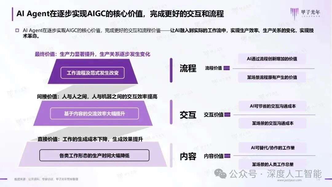 4.成形:AI Agent的诞生。仅有“大脑”(大模型)还不够,还需要“肢体”和“工具”。AI Agent的本质是将具备认知智能的大模型(AIGC能力)与软件程序、API接口、自动化工具以及感知系统(传感器)相结合。大模型充当Agent的“决策中枢”和“知识引擎”,负责理解、规划和生成;而外部的工具和程序则成为Agent的“手和脚”,负责执行具体动作(如操控软件、发送邮件、查询数据库、控制智能设备)。例如,AutoGPT、BabyAGI等早期实验项目,展示了AI如何自主调用网络搜索、文件读写等工具来完成用户设定的目标。至此,一个能听、能想、能说、能行动的完整AI智能体雏形初现。