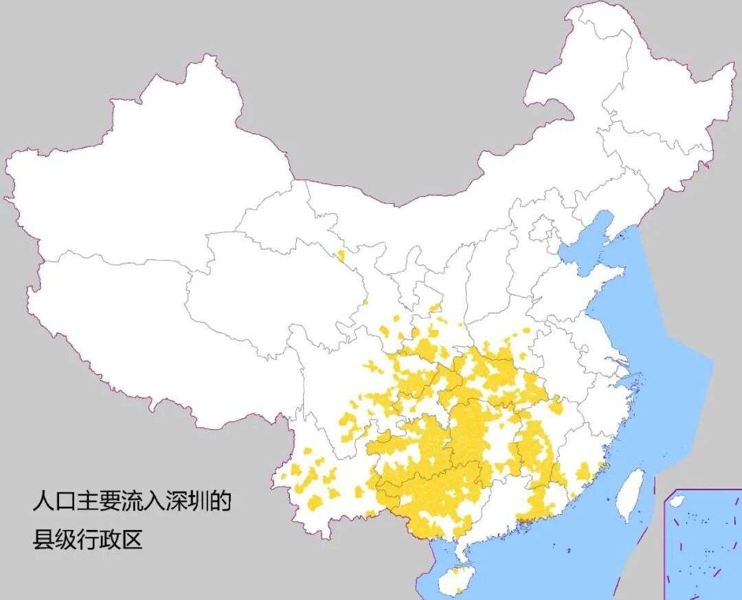 人口流入深圳第一多的地方如下图所示。深圳有1798.95常住人口,其中户籍人口631万,外地户籍1167.95万,占比大约65%。深圳是四大一线城市中外来人口最多、占比最高的一个。外地首选深圳的人口,也就是深圳虹吸的势力范围,包括广东省东部——客家人为主的区域,以及全国中南部多个省份——广西、湖南、江西、湖北、重庆、四川、贵州。