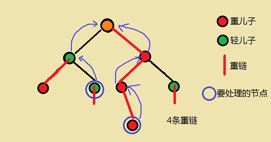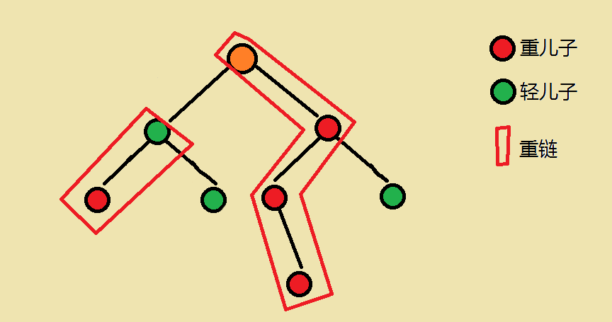 图中的红色边即为重边,重边连成的链,与红色边相连的所有节点,即为重儿子,0节点即为链头