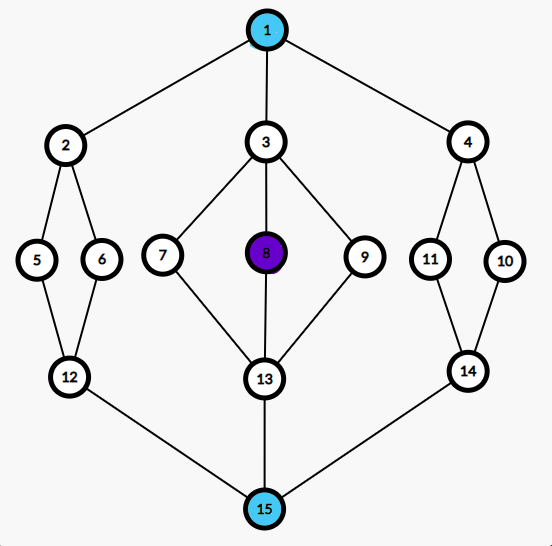如上图所示,我们同时从起点(\(1\))和终点(\(15\))开始搜索,就可以较快的搜索到最终答案(\(8\))。